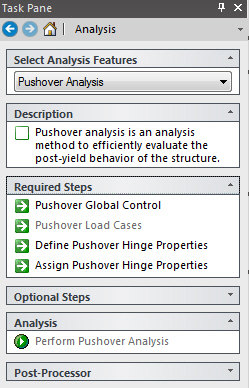 Display work procedure, required input items and optional input items for each analysis case. This helps the user to enter the analysis data easily. Task Pane displays work procedure for advanced analysis functions and description on input items so as to enable the user to work more easily. In addition, Task Pane data can be saved in html format in the User Folder, so that the user can directly write or add the required input items for analysis. |
